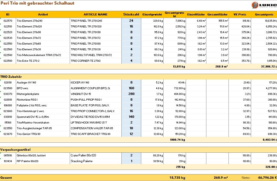 Wir verkaufen einen Posten Peri Trio Wandschalung mit gebrauchter Schalhaut und Zubehör in sehr guten Zustand mit ca. 270m²,